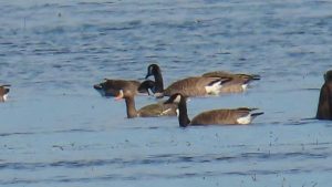 Some of the more determined birders ventured further along Trotter Dyke searching for some of the rarer migrants. Persistence pays and this small group discovered a locally rare Greater White-fronted Goose. Similar in overall colour to the abundant Canada Geese they’re distinguished by an orange bill and legs and a bright white face mask. It’s like searching for a needle in a hay field. Kudos to the finders!