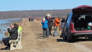 Waterfowl Day at Tiny Marsh is an annual event. For me, that makes writing something new and fresh about it increasingly challenging. The obvious place to start is with the weather but that’s such a mundane approach. Nevertheless comparisons with the previous year’s event are inevitable and participants frequently commented on the difference. The contrast is astounding. Last year was overcast and gloomy. Strong winds whipped up spray from the abnormally high water levels in Tiny Marsh and threatened to overtop Trotter Dyke. The exposed dyke offers scant shelter from the winds blowing in from nearby Georgian Bay and participants took turns huddling behind the only windbreak available, the single event vehicle.